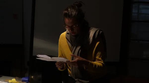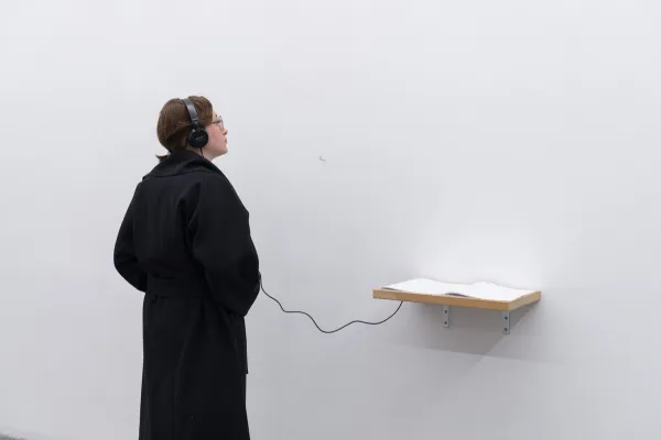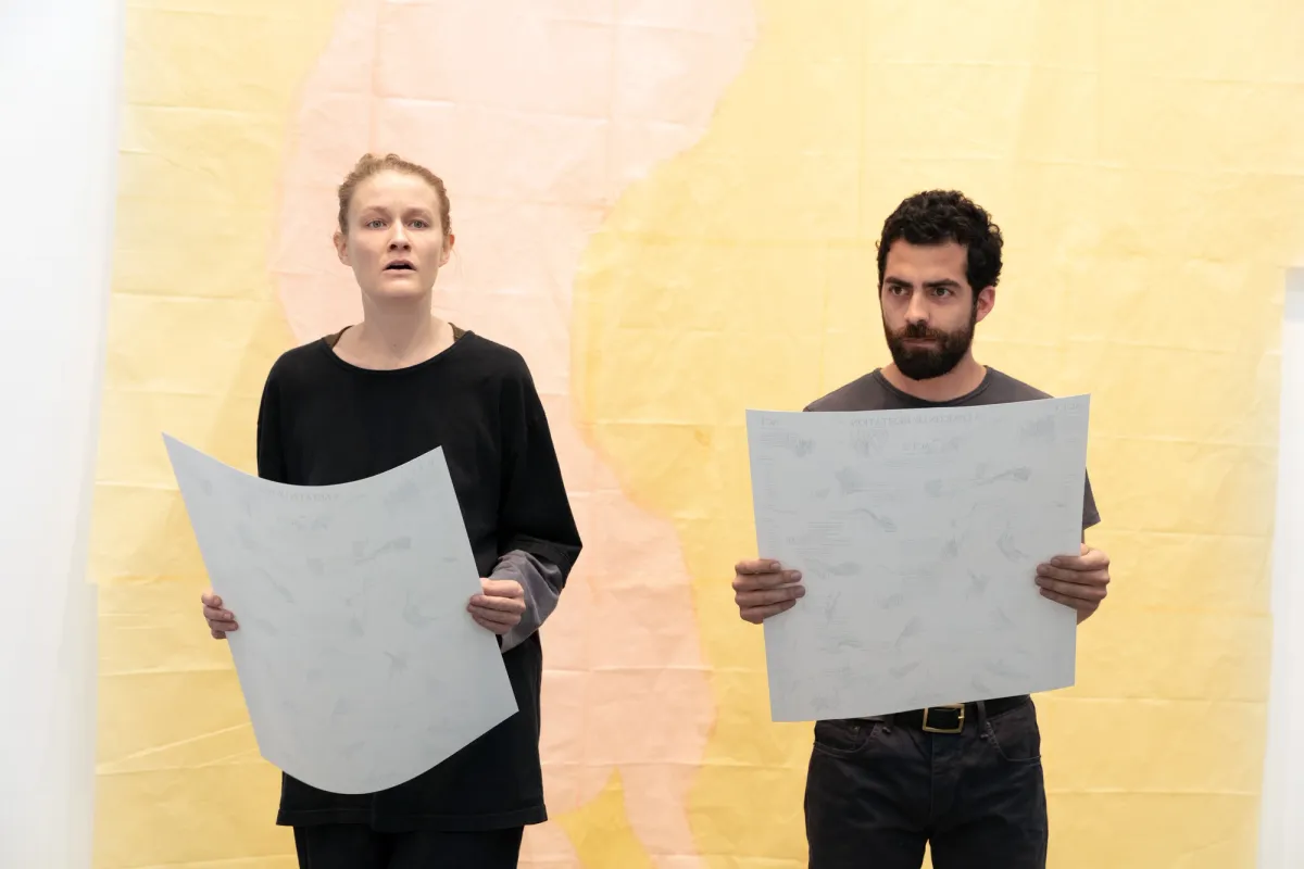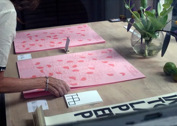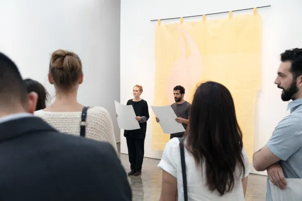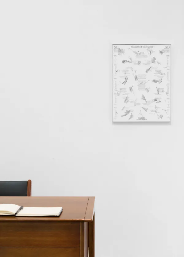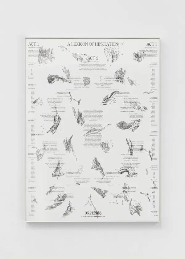 A Lexicon of Hesitation was performed in 2018 as part of Almost Solid Light, an exhibition curated by Mario Navarro at Paul Kasmin Gallery in New York City. It was interpreted by Emily Davis and Nicolas Norena. Styling was overseen by Sofia Beas. Cynthia Ventura advised on the topic of simultaneous interpretation. The script was edited by Mariana Pérez Villoro. The print was made in collaboration with Ana Rivera and Tiger Dingsun.