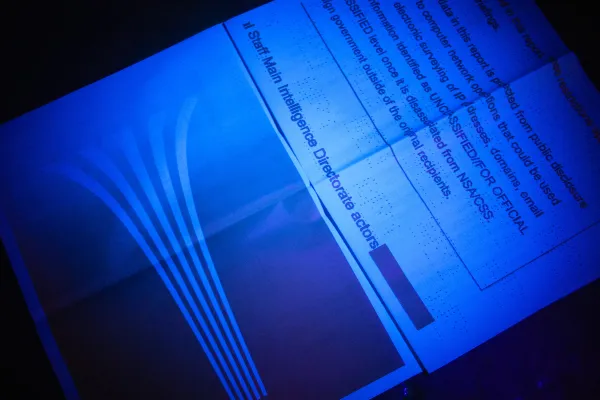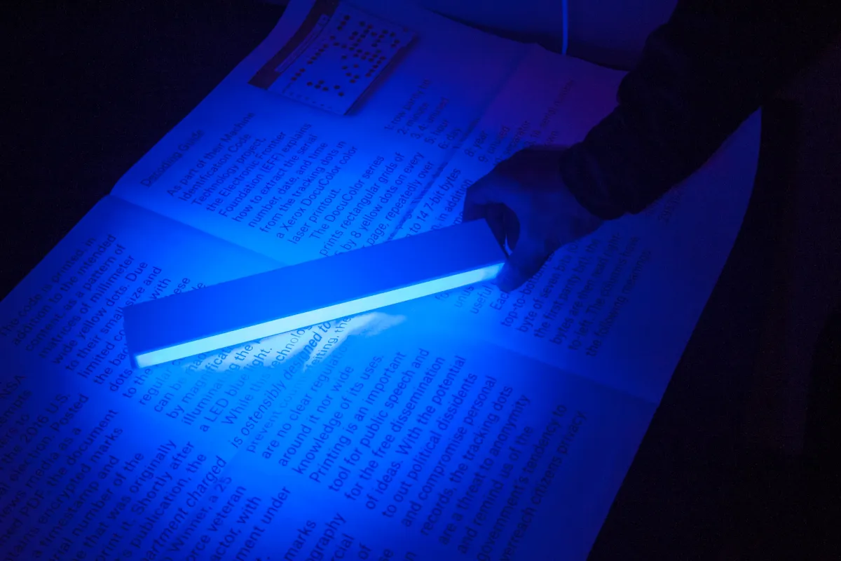 This publication explores a form of steganography embedded in most commercial printers. In addition to the intended content, many printers secretly encode metadata as a pattern of matrices of near invisible yellow dots. The project investigates the presence of such codes in a NSA classified report that was leaked to a news media outlet. Posted online as a scanned PDF, the document had such encrypted marks with a timestamp and the serial number of the machine that was originally used to print it. Shortly after the report’s publication, the Justice Department charged Reality Leigh Winner, an Air Force veteran and NSA contractor, under the Espionage Act. This technology has been enforced by the U.S. government to prevent counterfeiting and make printouts forensically traceable. However there are no clear regulations around it nor wide knowledge of its uses — becoming a threat to anonymity and political dissidents. The publication includes instructions to decode the yellow dot pattern as it explores the legibility of yellow ink over different lighting conditions.
