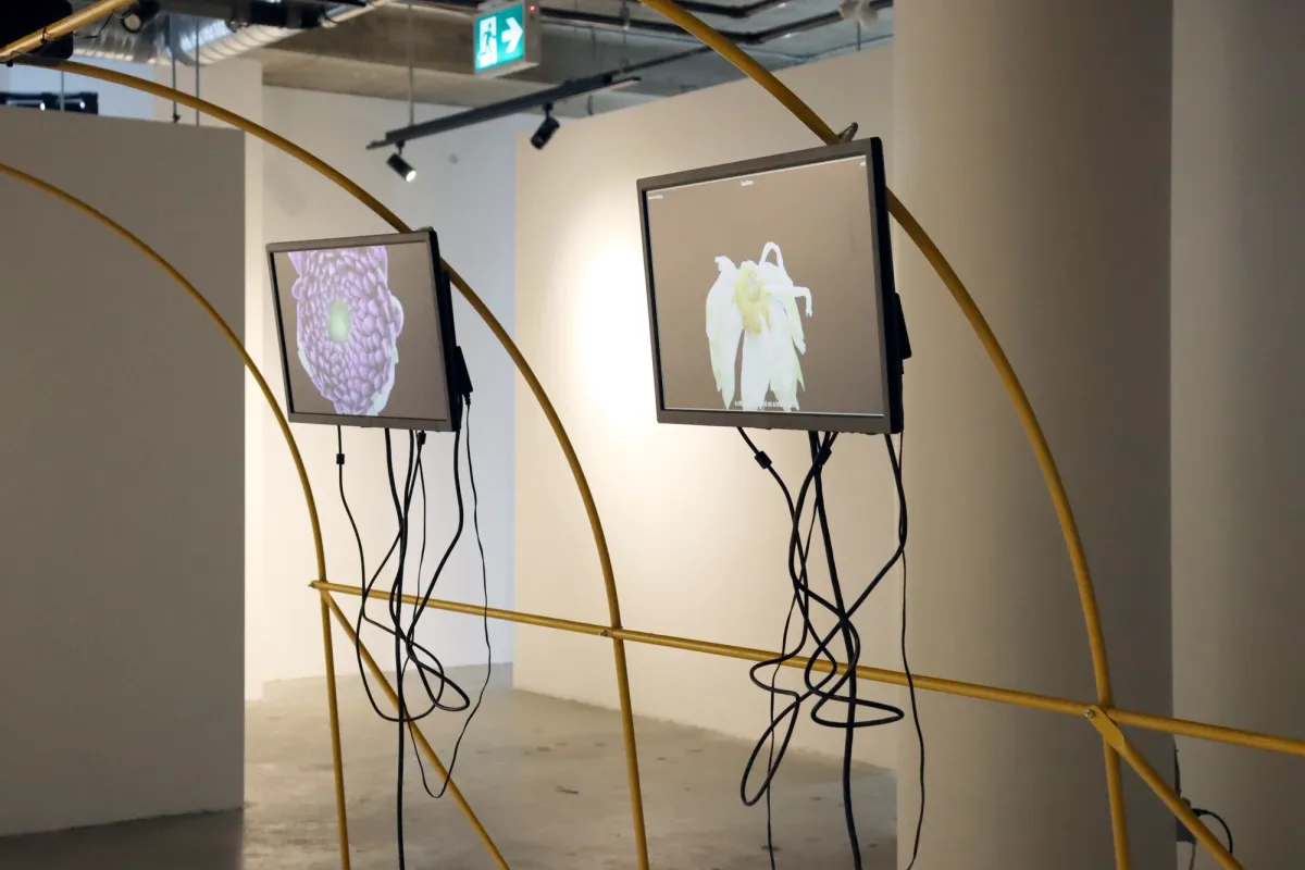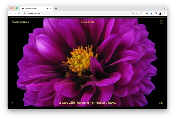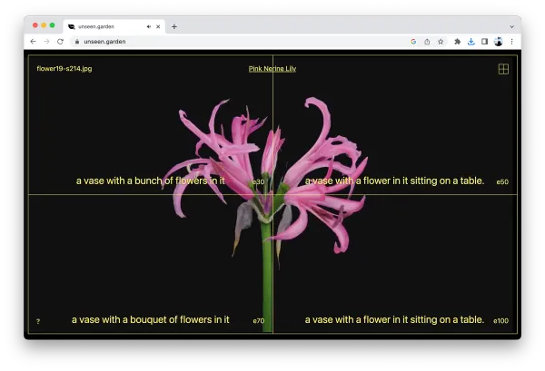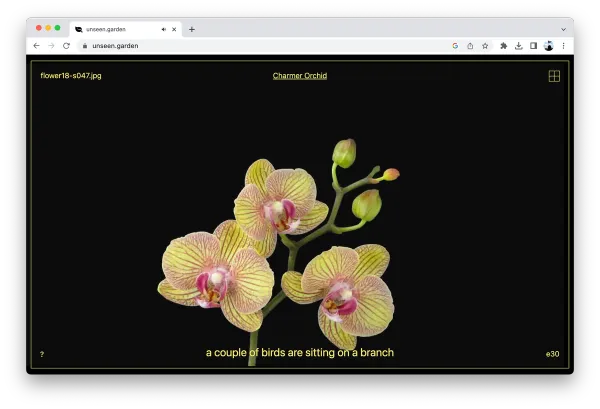 This installation features a series of timelapses displaying flowers blooming and decaying with auto-generated captions added by a custom-made program. The project explores the in-transferability of meaning between images and text and the politics behind organizing visual content into semantic structures. A technical reenactment of NeuralTalk, an early model designed to write sentences that describe images, this adaptation exposes the limits of object recognition technologies — its inaccurate outcomes make explicit the unstable relation between images and their conceptual representations. By applying the software to videos of plants in stages of transformation, this exploration makes cite of the anthropocentric mischaracterization coded into computers and the limited capabilities of machine vision when confronted with information that falls outside of a specific worldview.