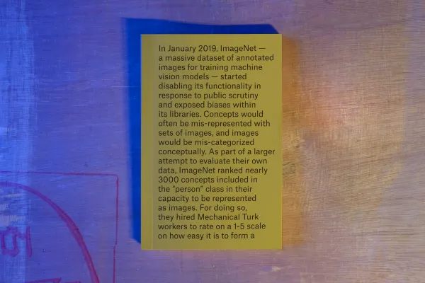 These works explore the impact of machine vision models used to identify people, and the datasets with which they are trained. Putting into question the very act of organizing images as conceptual classes, they address both the in-transferability of meaning between images and concepts and the amplification of social biases always present in such a process. Under an ongoing search for what we understand as “fugitive images,” these explorations are artifacts at the margins of algorithmic vision and speculate on the possibility to escape the logics of computational representation.