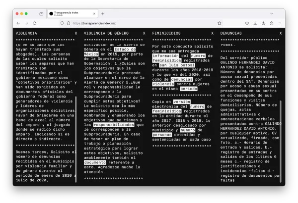 Transparencia Index is a custom-made platform that automatically scrapes data from the Plataforma Nacional de Transparencia, a system through which people can request public information from the Mexican government. The software identifies existing requests associated with topics of common interest that were previously denied on the basis of containing information classified by authorities. This ever-increasing flow of unanswered civic concerns are organized as an interactive website that aims to register, through labyrinthine hyperlinks, the bureaucratic opacity and strategic silence of the country’s administrative institutions.