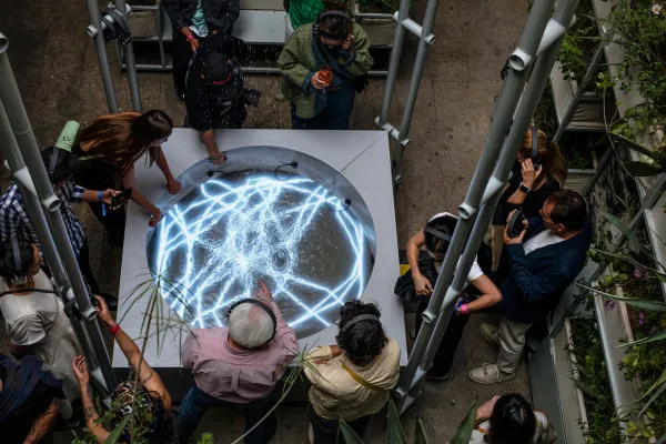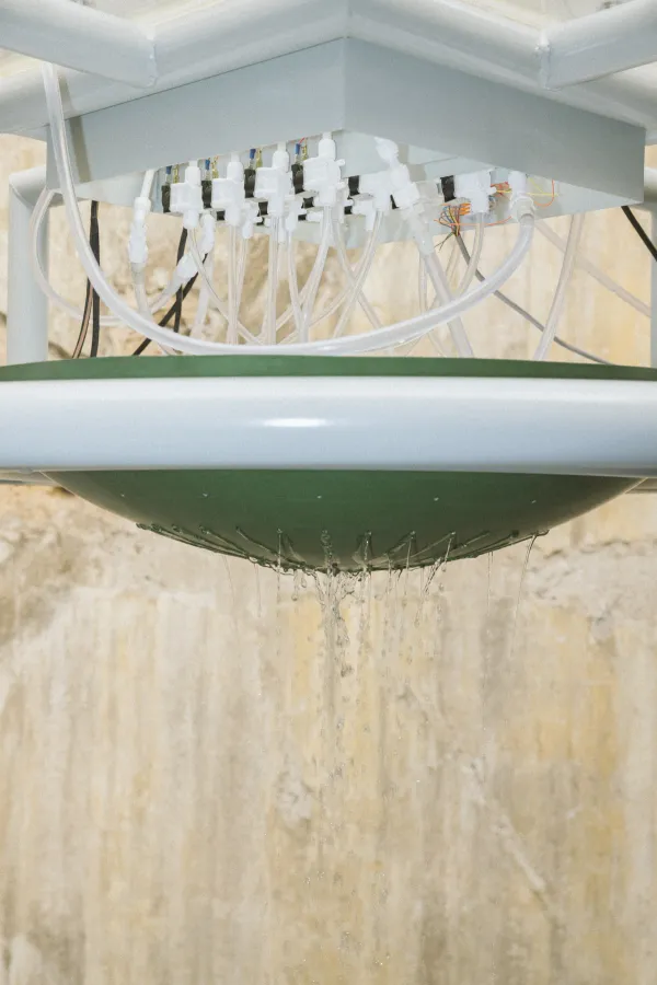 HIDROARPA is a large-scale hydraulic installation that generates sonic atmospheres for a plant ecosystem. A participatory fountain is activated by the presence of visitors. A system of sensors and electronic valves oscillates the falling water to produce music using hydrophones as reactive instruments. Developed in collaboration with composer Leslie García, the music is programmatically produced from the water flows as frequencies designed to stimulate specific plant behaviors. Inviting distinct listening experiences, this immersive instrument explores the ways in which diverse life forms perceive the physical dimension of sound.